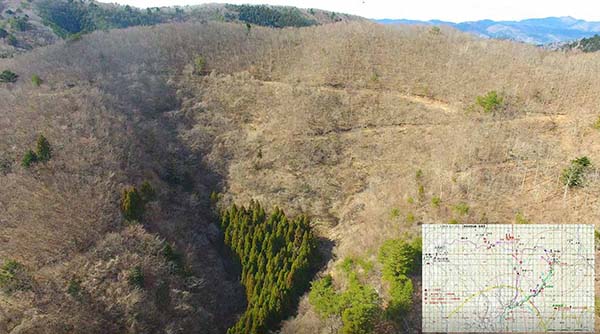 - 密集した植林杉林などは、横方向からでは電波がほとんど遮断されるが、直上付近に行くことが出来てドローン操作に障害が無い距離であれば(麓側からの探索で1.6 km確認)探査と大よその位置特定が可能である。