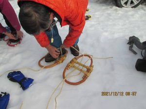 装着訓練から講義内容実践、11:00➡ワカン、アイゼン装着藪中雪上歩行途中戻り